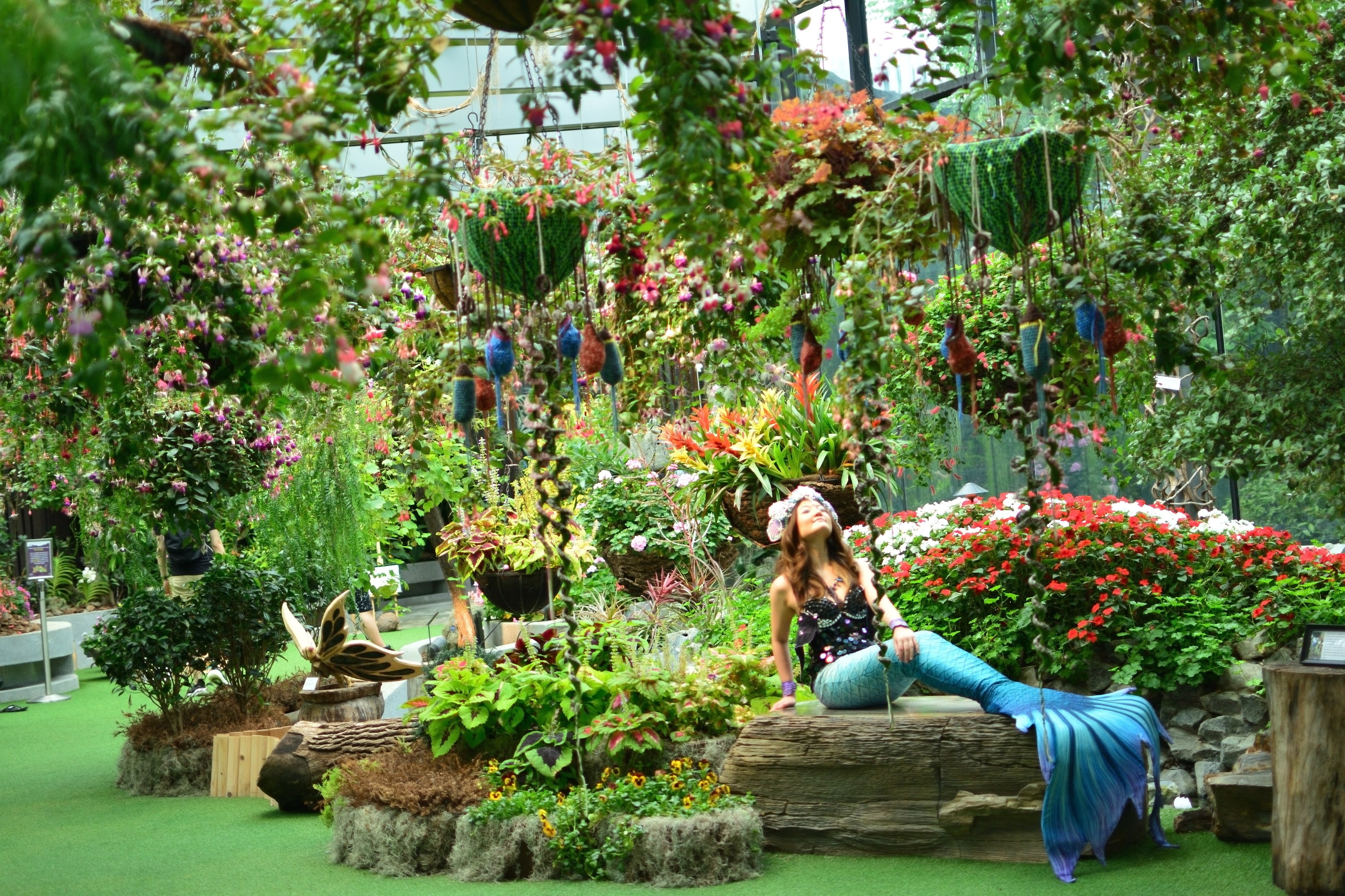 - Be greeted by a lush and colorful arrangement of flowers hanging from the ceilings